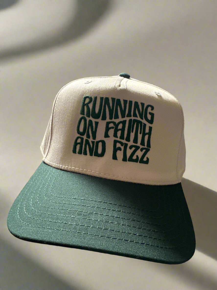 Faith & Fizz is a 5-panel hat with adjustable backing and embroidery detail.Â