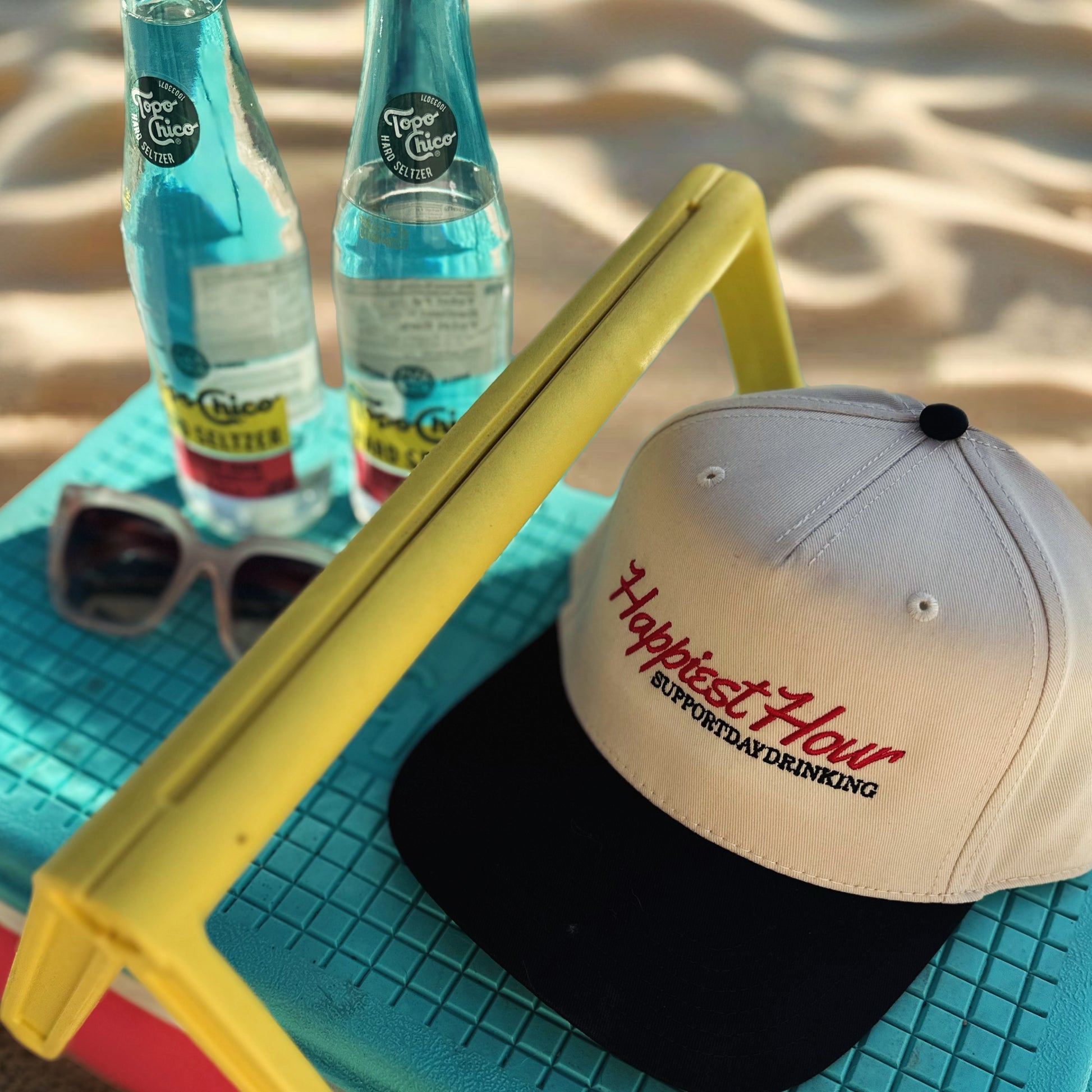 happiest Hour Hat is a 5-panel hat with adjustable backing and embroidery detail.