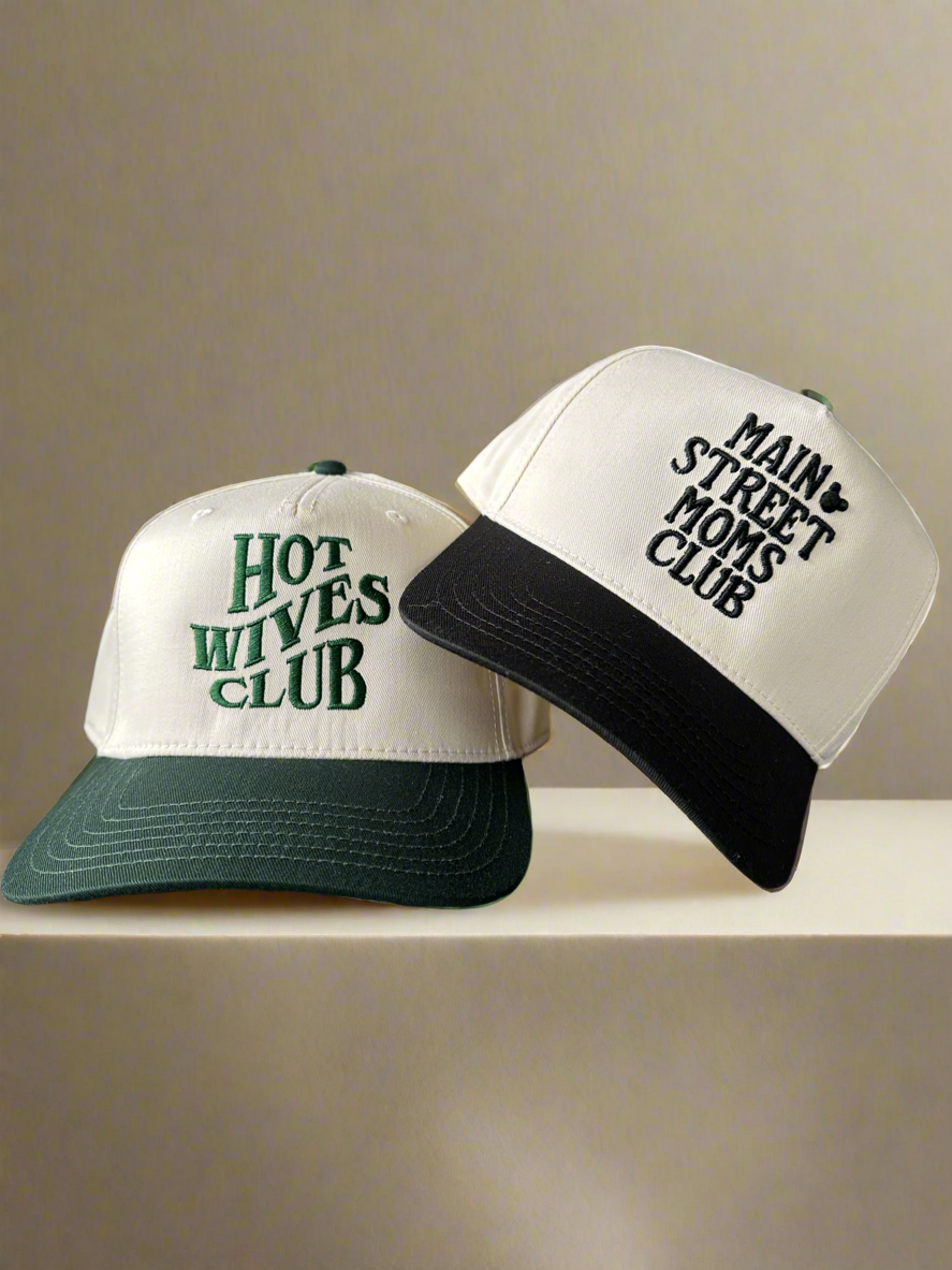 Hot Wives & Disney Moms is a 5-panel hat with adjustable backing and embroidery detail.