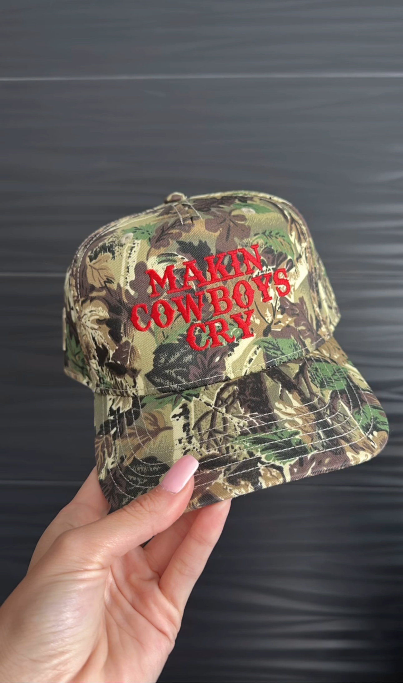 Makin Cowboys Cry is a 5-panel hat with adjustable backing and embroidery detail.Â