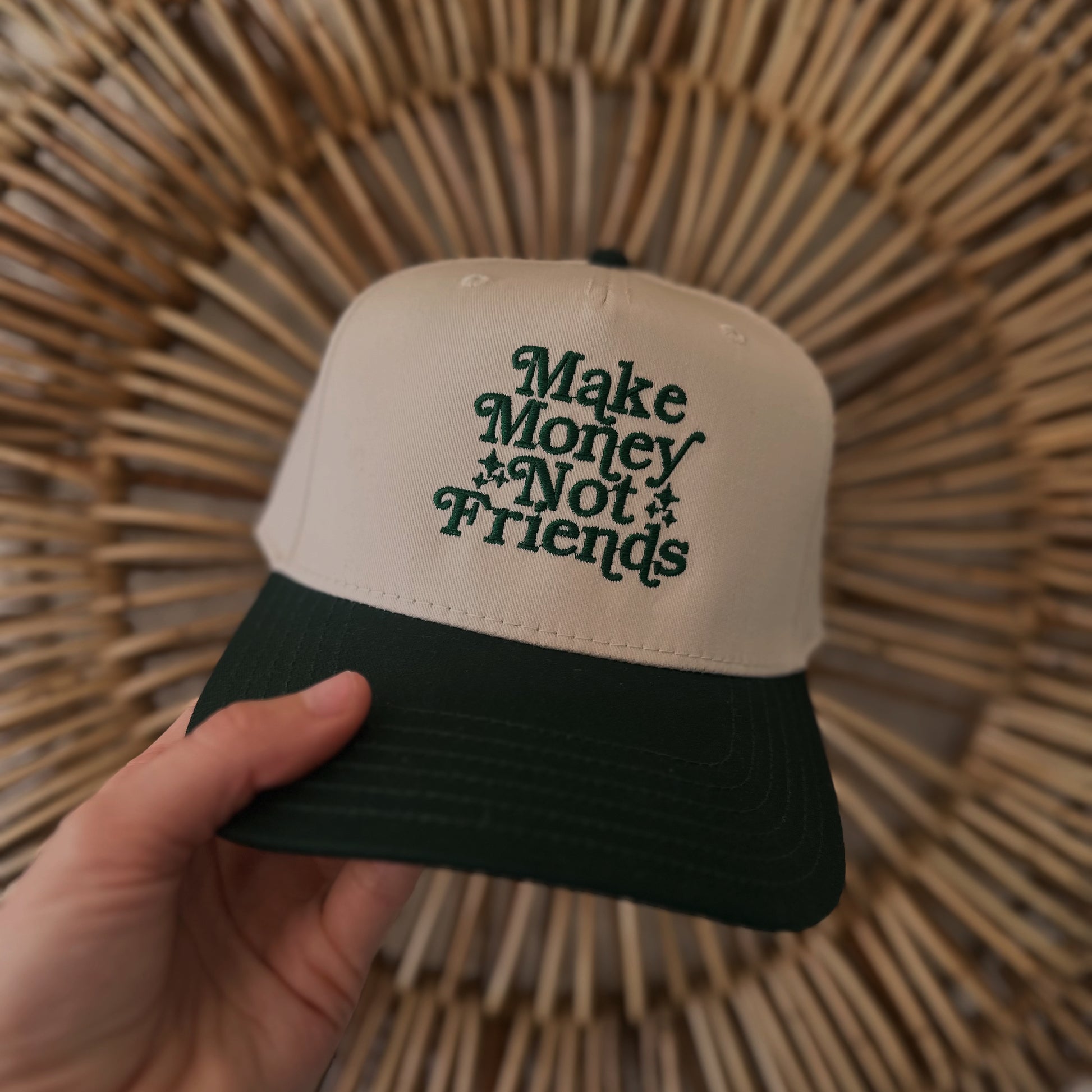 Make Money not Friends is a 5-panel hat with adjustable backing and embroidery detail.Â