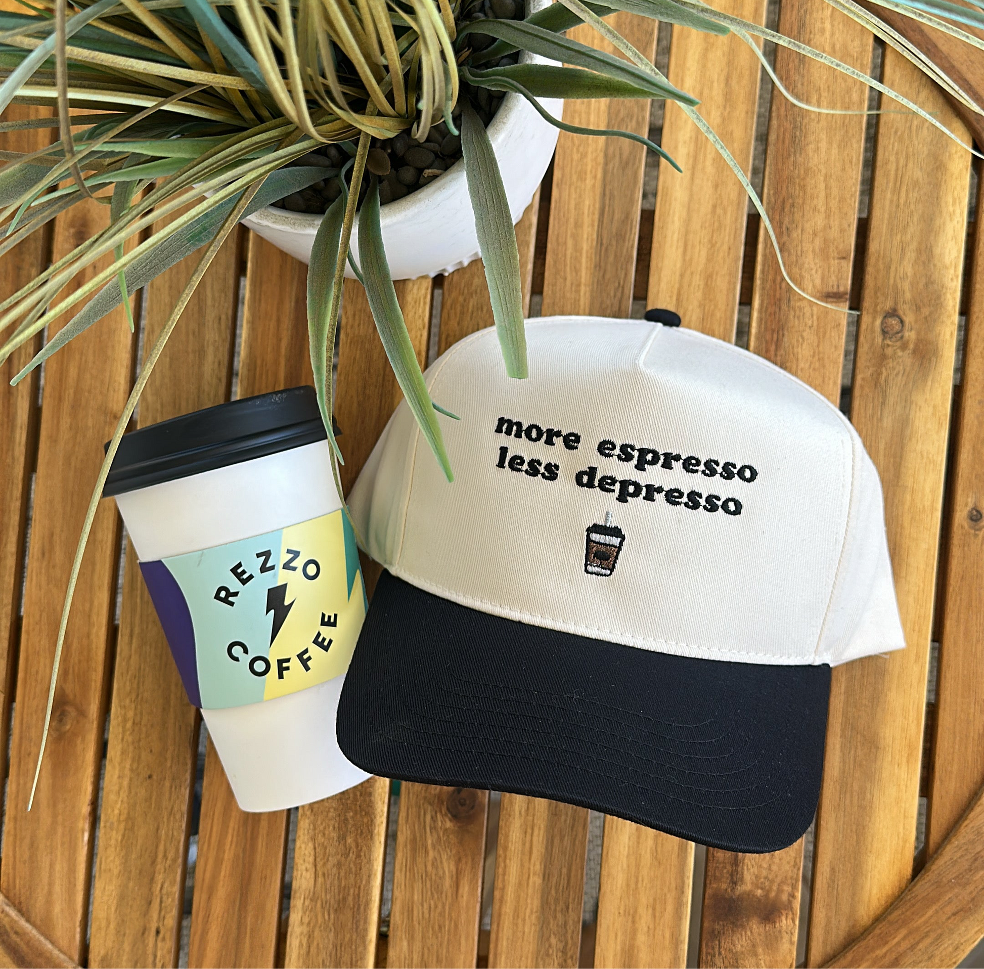More Espresso Hat is a 5-panel hat with adjustable backing and embroidery detail.