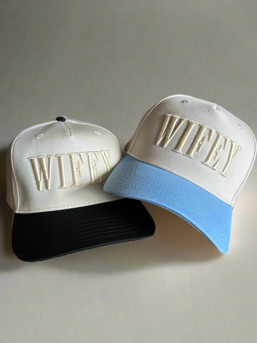 WIFEY is a 5-panel hat with adjustable backing and embroidery detail.